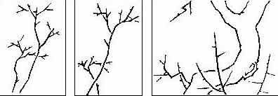 ★三线组合构图法:一幅国画梅花,梅花枝干态势,可以用几条线作为基本单位来概括成构图骨架。构图时一条线太孤立,两条线仍然单调,三条线四条线足可以了。这三条线中有一条是主线,在全画中起主导作用,在画面中占的份量较重,位置比较明显,势也比较清楚。第二条是辅线,辅线和主线的走势基本一致,略有角度,以辅助主线的势,但比主线要弱(或短、或细、或淡)。第三条是破线,用它把主线和辅线穿插交织起来。三条线交叉的方法很多,可以自下而上。或自上而下,可以从左到右,也可以从右到左,千变万化,全在于灵活运用。
