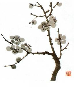 点墨梅,就是淡墨点梅花。方法是用秃笔先蘸淡墨,再蘸适量较深的墨,然后按花的正侧偃仰背,以中锋垂直点下。花朵分布有疏有密,点要圆,不露锋,花瓣墨色有浓淡,使之有立体感。花心、花须、蕊头、花蒂,要用浓墨在花瓣将干未干时勾点。最后,在枝条上加苔点。