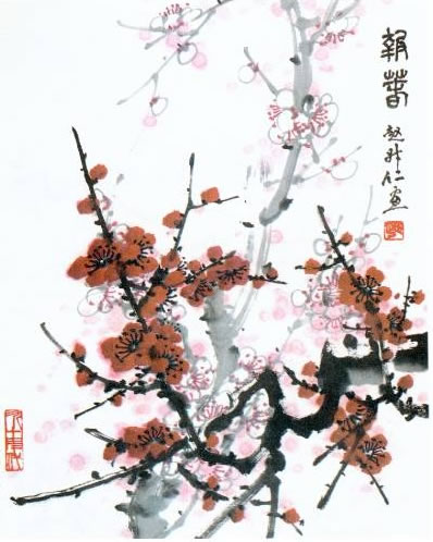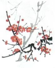 背面的花:生长在枝干后边,只见花萼,不见花心和须蕊。花托上部分裂成片状,称为花萼,共五片,有红、暗红和绿色之分,在花与枝的联接处,以浓墨点垛而成,点一点或五点。侧面多见两三片萼,用笔随意一些,墨点要稍浓重,不宜太细,也不必拘泥于严格的组织结构,力求总体视觉舒服即可。