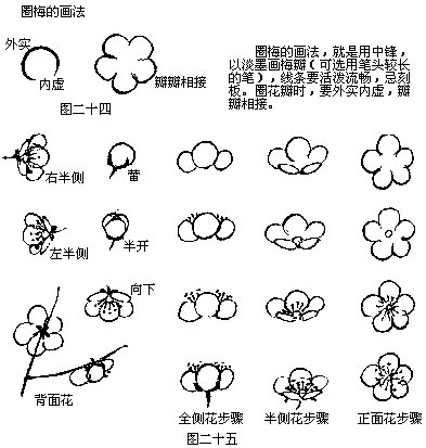 梅花有正、侧、偃、仰、背等朝向,有盛开的、初放的、含蕊的、花蕾、开残的,并有单瓣、复瓣两种花式。写意画,一般画单瓣为多。梅花为五瓣,花瓣呈圆形。开残的可画四瓣、三瓣、二瓣。花的色彩有红、粉红、白、黄等。也有白色略带粉绿的,但不多见。花朵的表现方法,常用的有三种:圈花法(又称勾勒法);点墨法(又称没骨法);圈点结合法。