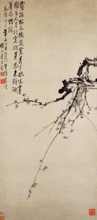 李方鹰极力主张在师法自然和传统的基础上自立门户,以创造出自己的独特风格。此图在画面右角绘倒梅一枝。似乎信手拈来,却得其天真,具有淳朴、自然之美,奇也在其中了。画上有画家自题:“雪拥梅花傲岁寒,秀才风味画图有。人言结实溅牙齿,未解调羹尚借酸。”