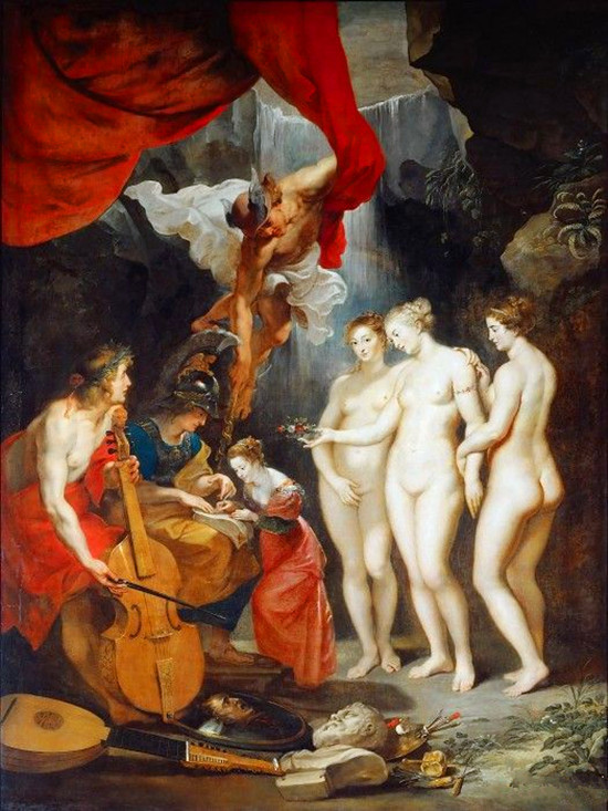 这是鲁本斯为法国卢森堡宫所作的《玛丽·美第奇的一生》24幅组画中的第三幅。这一组画是玛丽于1621年委托鲁本斯以她的一生的经历为主题创作的。这幅画表现玛丽所受良好的贵族教育。穿红衣的玛丽正在向坐着的智慧女神雅典娜(蓝衣)学习,并在书上写着字;左边拉琴的是太阳神阿波罗,教授玛丽音乐和艺术;上面是赫尔墨斯雄辩之神,意寓玛丽将来的雄辩口才;右边是美惠三女神。地面上还有些与艺术绘画雕塑有关的文具物品。美第奇出生于名门贵族,嫁给法国王亨利四世,是一桩政治婚姻。