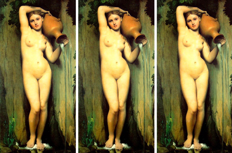 安格尔一生中在裸体素描上下过精深的功夫,而且只有当他面对裸体模特儿时,他的现实主义真知灼见才特殊地显现出来。他曾说:“标准的美——这是对美的模特儿不间断观察的产物”,还认为:“一幅画的表现力取决于作者的丰富的素描知识;撇开绝对的准确性,就不可能有生动的表现。掌握大概的准确,就等于失去准确。那样,无异于在创造一种本来他们就毫无感受的虚构人物和虚伪的感情。” 这位古典主义绘画的末代风流画家,吸收文艺复兴时期前辈大师的求实的技巧,使自己的素描技巧发挥到炉火纯青的境地。这里所不同的只是,象马萨卓、米开朗基罗、乔尔乔奈等大师的裸女体现的是一种充满人性的时代理想,而安格尔在裸女上所寄予的理想,则是“永恒的美”这一抽象概念。究其实,乃在于寻求以线条、形体、色调相谐和的女性美的表现力。这在他那些描写土耳其宫女的裸女画上尤为明显。晚年,安格尔画了这一幅《泉》,则进一步反映了画家对美的一种全新观念。