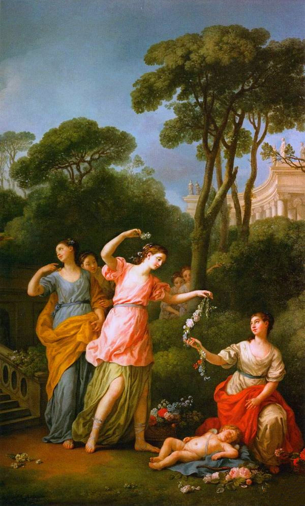 希腊姑娘用鲜花装饰熟睡的爱神 维安 法国 1773年 335x194cm 布油彩 巴黎卢浮宫