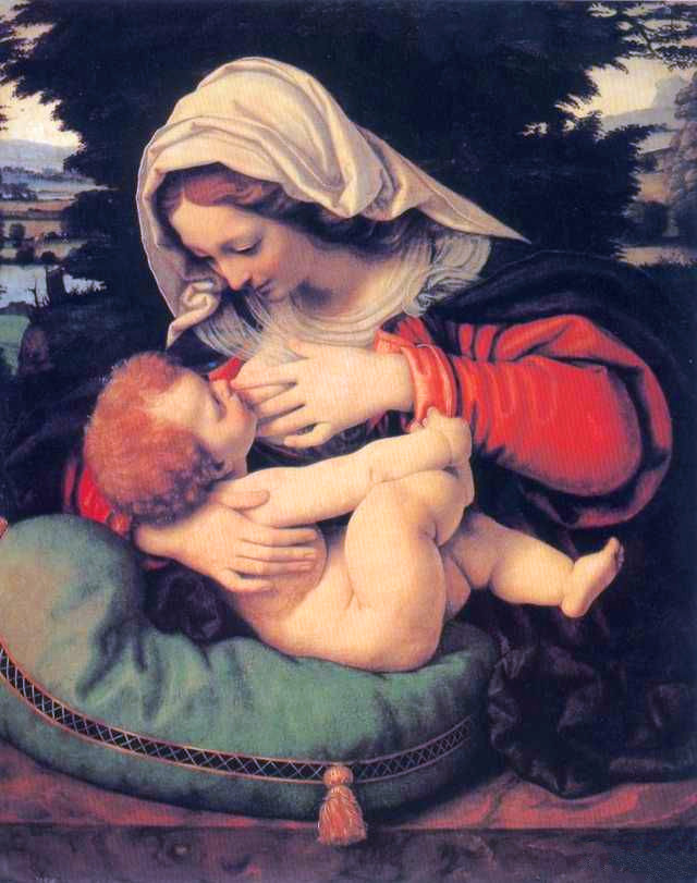 画家在《绿垫圣母子》中,以特写式的半身形象描绘圣母子,主要表现母亲喂奶这一世俗情节,圣洁的母爱十分感人,活泼略带顽皮的小耶稣抱起小脚似乎想和妈妈说点什么,在这里人情、人性代替了神性。画家以细腻的笔触和色块刻画人物的肉体,并以柔软的绿色靠垫作衬托,更增加生活的温馨。用大自然作背景,注入了画家对自然美的赞颂。
